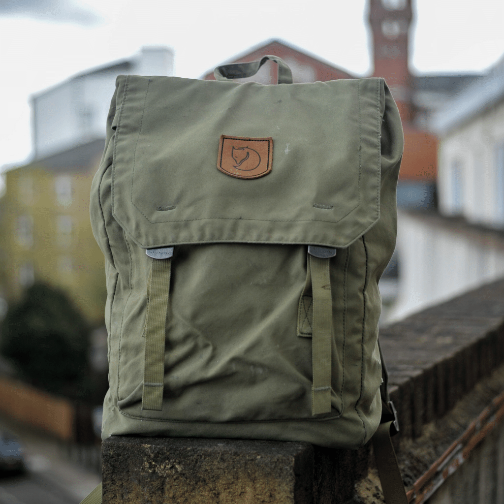 Logo Fjallraven yang terbuat dari kulit.
