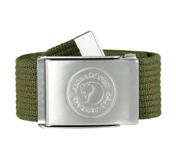 Sabuk kanvas dengan lencana logo 1960 pada gesper logam. Diproduksi tanpa PFAS.